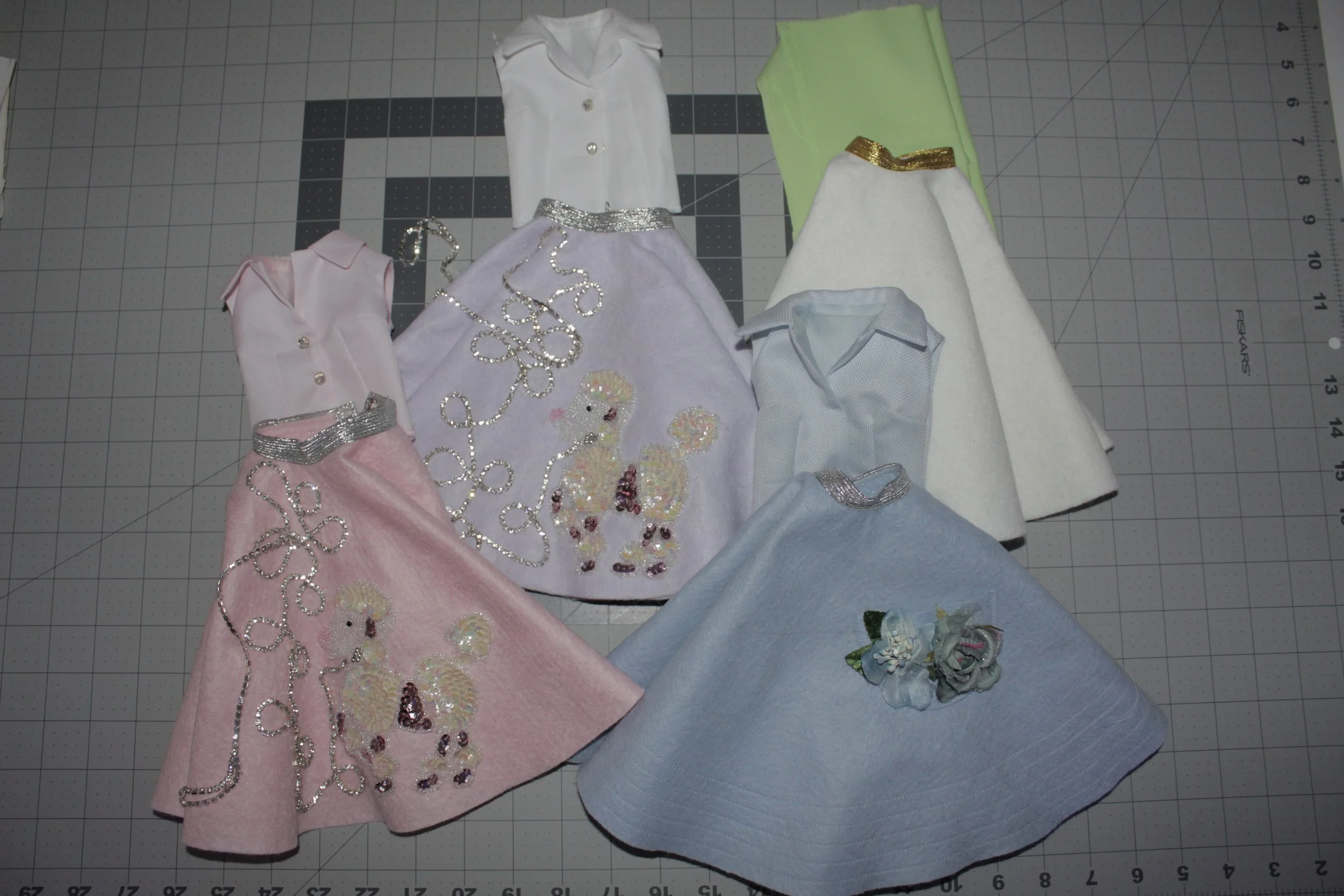 Finished the 2 poodle skirt sets, one pink and one lilac/lavender. The blue felt swing skirt set with blouse almost done. Then I will finish the cream felt skirt and apple green blouse. All very retro! I will start listing the first 3 mentioned this weekend.